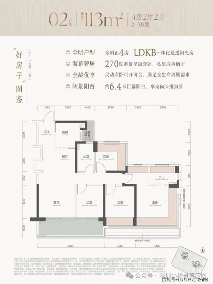 113㎡的4房2厅2卫,设计的是经典竖厅格局,客厅3.7米开间,LDKB一体化,S墙设计预留冰箱卡槽位,动静分区,四开间朝南,分别做到了主卧20.39㎡/次卧12㎡/次卧8.85㎡/次卧8.64㎡(包含墙体飘窗),U型厨房还带1个设备平台约2.7㎡,卫生间干湿分离,得房率约81.4%(不含赠送),客厅连接次卧出6.4米长的大阳台约11.52㎡,西南朝向。 套内面积92.22㎡+飘窗15.36㎡+阳台5.76㎡+设备平台2.7㎡=实得面积116.04㎡,加上赠送后得房率约102.37%。