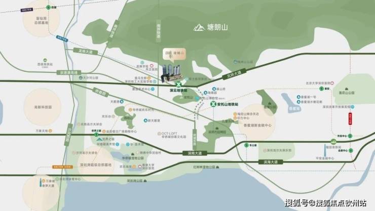 中心区域:深圳山海城中轴,左手香蜜湖、右手华侨城,六大总部基地环伺