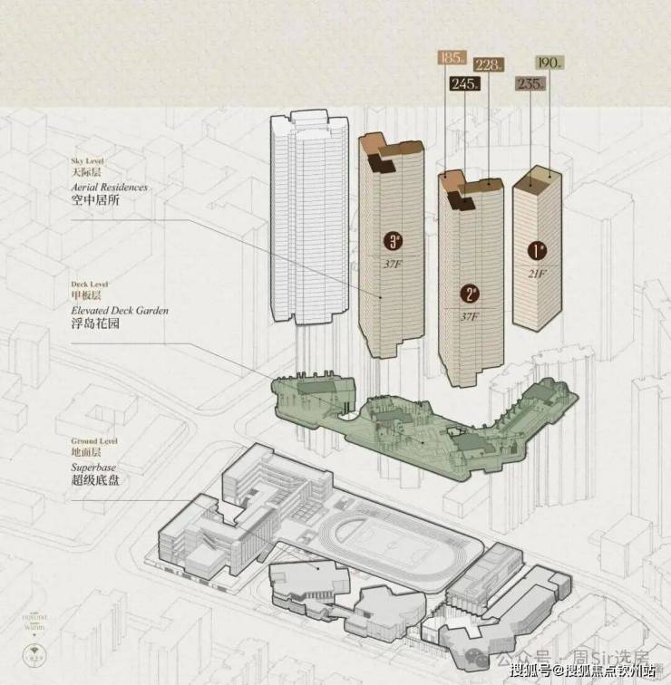 说直接点,就是将四栋建筑安置在这个甲板上,形成一个超级社区底盘+ 浮岛绿化甲板的模式。