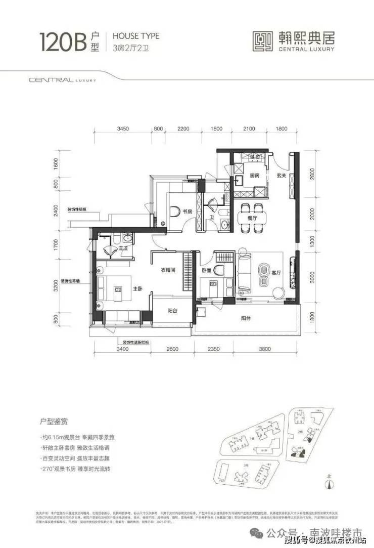 120㎡B户型:位于三单元05梯腿、四单元01、02、05梯腿,朝东朝南都有分布,3+1房2卫,主卧面积达30多㎡,主卧一侧的衣帽间+阳台进深1.6米,开间4米多,可改+1房。不过阳台开间约6.15米,没有105㎡户型有优势。