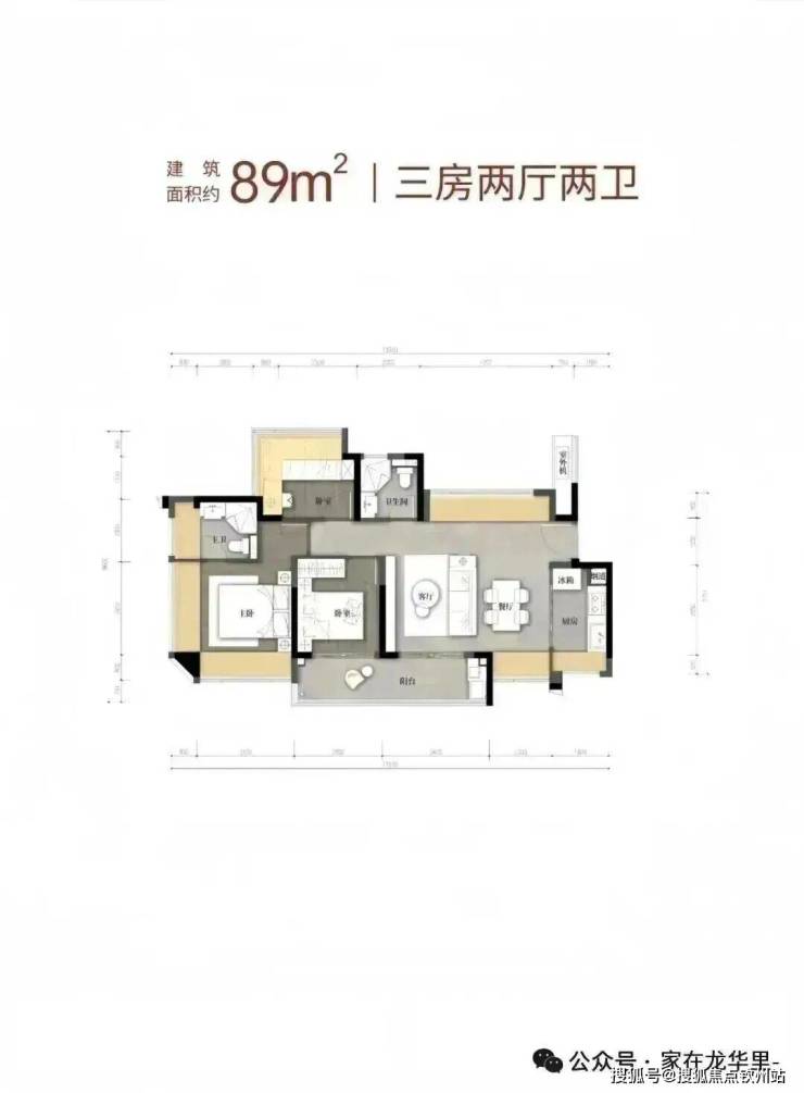 89㎡的3房2厅2卫,1栋02.03户型,经典竖厅,客厅3.4米宽,LDKB一体。S墙预留冰箱位,主卧16.28㎡/次卧9.53㎡/9.42㎡(含飘窗)。U型厨房,卫生间干湿分区。得房率79.6%(不含赠),客厅连次卧带9.45m²阳台,西南向。套内70.43m²+赠14.58m²=实用85.01m²,含赠得房率96.1%。
