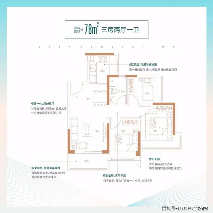 78㎡的3房2厅1卫,设计的是经典竖厅格局,客厅3.4米开间,LDKB一体化,动静分区,三开间朝南,主卧270°转角飘窗,L型厨房,卫生间干湿分离,得房率:74.71%(不含赠送),西南或东北朝向。