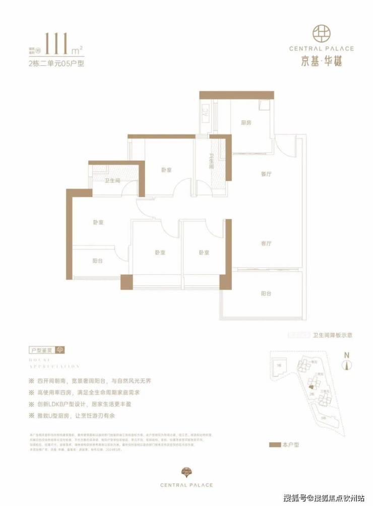 仅2栋2单元05户型才有,设计的是经典竖厅格局,LDKB一体化,动静分区,四开间朝南,U型厨房,卫生间干湿分离,得房率约73%(不含赠送),阳台西南朝向。