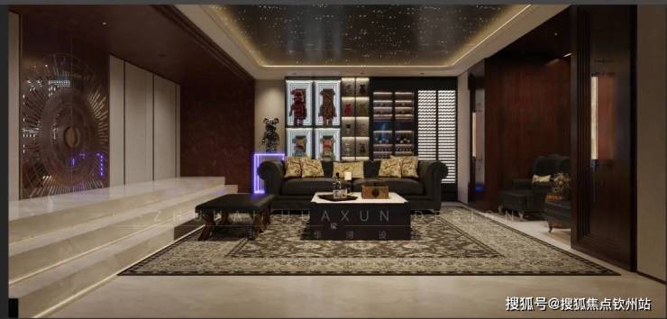 深色皮质沙发搭配精致抱枕,尽显舒适与质感。前方的茶几上摆放着酒水等物品,方便休闲时取用。一侧的墙面装饰着潮玩摆件,增添了时尚活力。