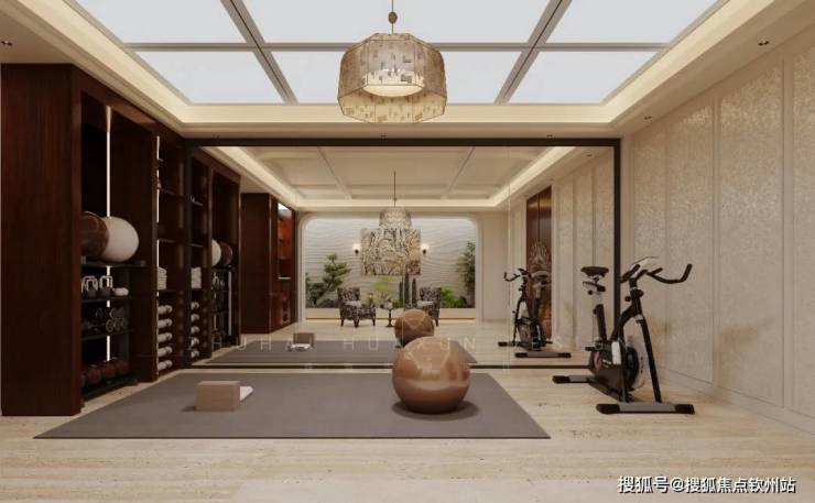 天花板上的吊灯造型独特,散发着柔和光线,为空间增添了温馨氛围。整体布局与装饰,将健身功能与美学享受巧妙融合,打造出一个兼具实用性与品质感的健身场