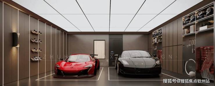 车库的墙面采用木质与金属元素结合的设计,一侧整齐悬挂着滑板,另一侧的储物柜则有序收纳着头盔、球拍等物品,既满足了收纳需求,又增添了空间的运动与时尚氛围。