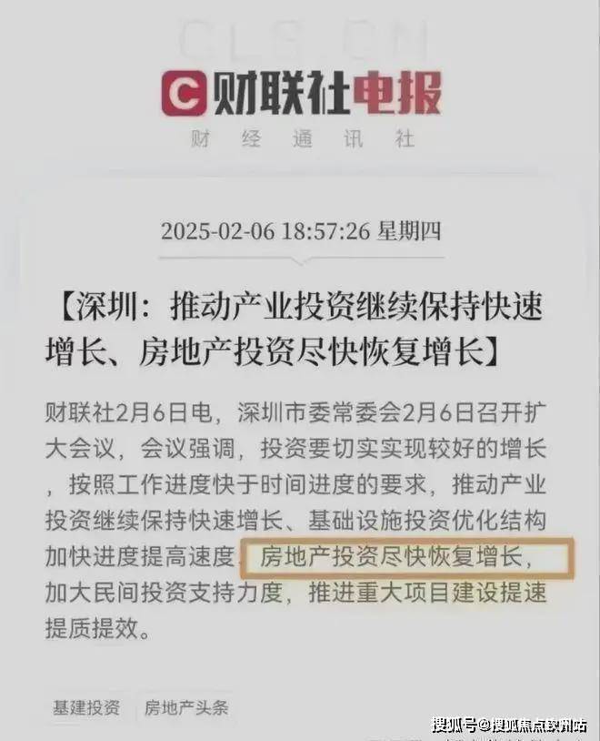 财联社2月6日电,深圳市2月6日召开扩大会议,会议强调,投资要切实实现较好的增长,按照工作进度快于时间进度的要求,推动产业投资继续保持快速增长、基础设施投资优化结构加快进度提高速度、房地产投资尽快恢复增长,加大民间投资支持力度,推进重大项目建设提速提质提效。
