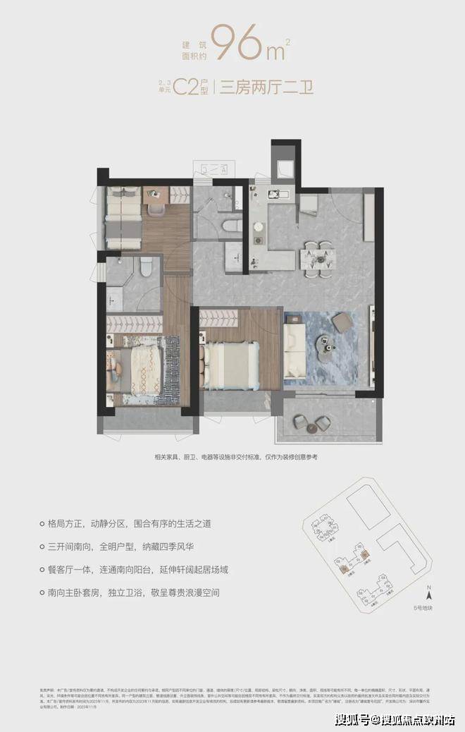 “10.7 m纵深紧凑南向三房”,10.7 m纵深餐客一体,通风采光极佳