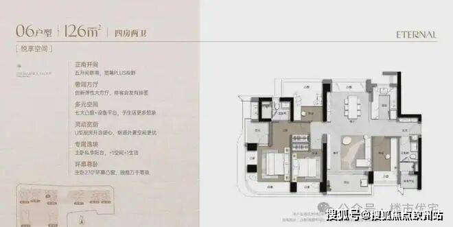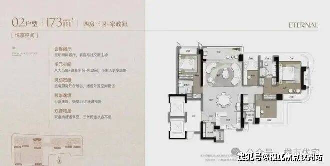 173m²的4房2厅3卫+家政间,设计的是竖厅类双龙抱珠格局,独立电梯厅入户约8.13㎡,客厅5.55米开间,LDKB一体化设计,主卧套房270°环幕凸窗+私享阳台,八大凸窗+设备平台+家政间,分别做到了主卧27.1㎡/次卧14.87㎡/次卧12.38㎡/次卧8.38㎡/家政间2.93㎡+阳台1.38㎡(实测面积,去掉墙体),U型厨房,公卫三段式干湿分离,得房率超90%(包含赠送),阳台9.56㎡正北朝向,看会展中心+市民广场。