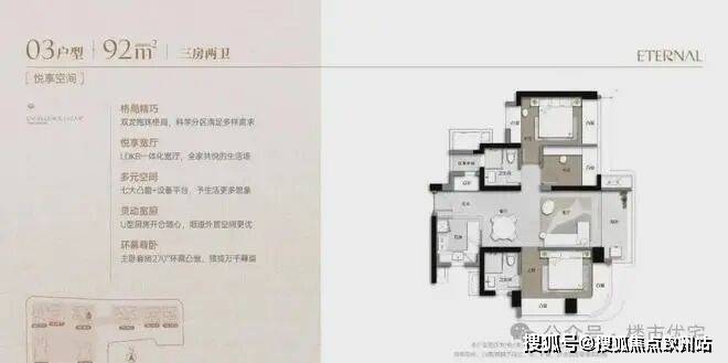92m²的3房2厅2卫,设计的是双龙抱珠格局,客厅3.2米开间,LDKB一体化宽厅,主卧套房270°环幕凸窗,七大凸窗+设备平台,分别做到了主卧16.06㎡/次卧12.82㎡/次卧6㎡(实测面积,去掉墙体),U型厨房,卫生间干湿分离,得房率超90%(包含赠送),阳台实测6.54㎡正东朝向。