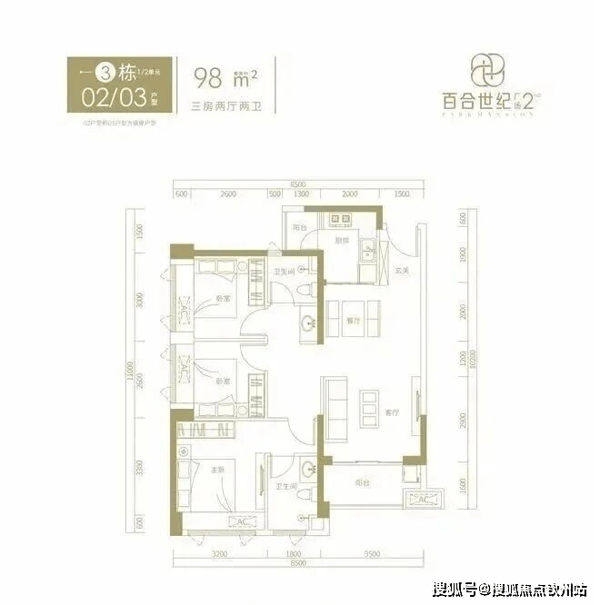 约98㎡ 三房两厅二卫 总价500-528万