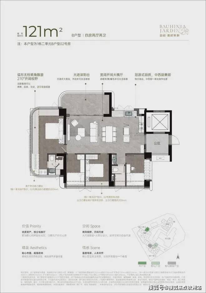 四房为主,多种厅式可选;大面积的飘窗利用,采光面大、实用率高;转角处使用弧形玻璃且都是无柱设计,景观视野佳;