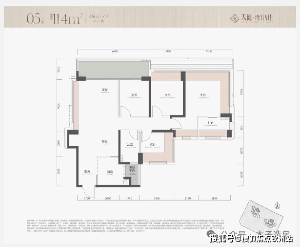 主卧套房带独立卫浴和全景飘窗,次卧与公卫采用类套房设计,适合多孩家庭。