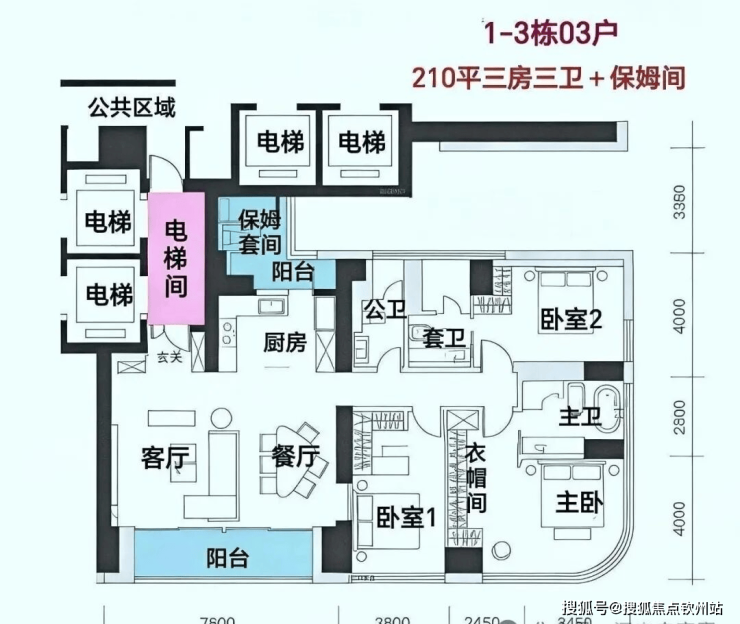 位于A栋(43F)共36套,层高3.6米,3T1,只做了4房5卫+保姆套间。