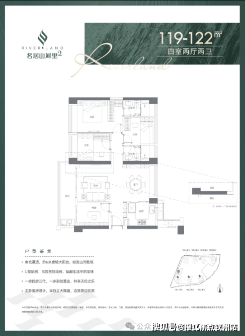 119-122㎡的4房2厅2卫,设计的是竖厅南北通透格局,客厅3.8米开间,四开间朝南,全屋飘窗,U型厨房,得房率:74.83%(不含赠送),阳台1.5米进深,6米长超大阳台,主朝西南向。