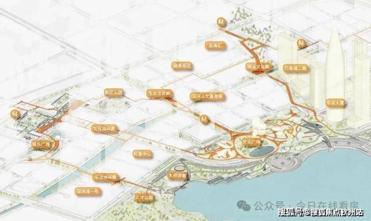 城市级连通系统:通过四维立体步行系统(首层、二层、地下及空中连廊)连接商业、写字楼、人才公园和中心河,整合复合型立体底盘(商业+公园),实现住区与城市公共网络的无缝对接。