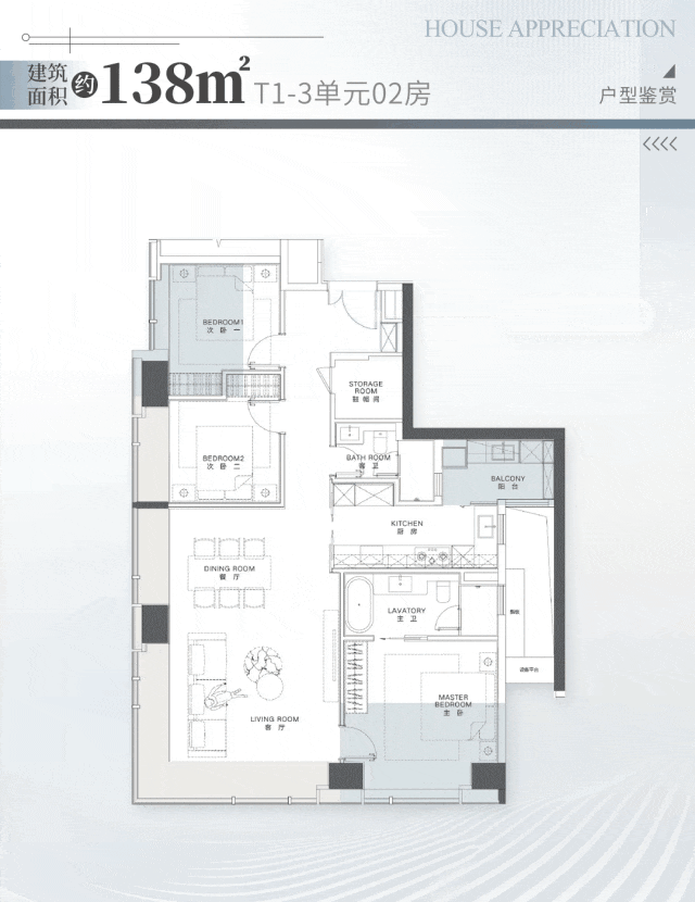 建面约138㎡三房,是妥妥的进阶改善户型,产品力同样不遑多让。