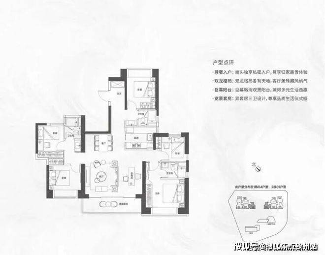 【124㎡的3+1房2厅2卫】1栋02/2栋04户型,电梯入户送独立公区,设计的是竖厅格局,动静分区,主卧套间设计,还有一个多功能间可以做书房,U型厨房,公卫三段式分离,得房率:72.07%(不含赠送)西南朝向;