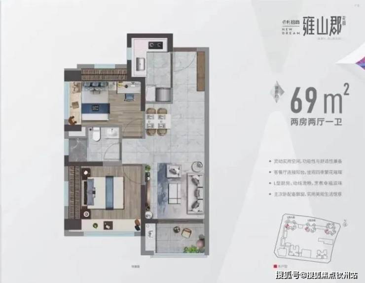69㎡的2房2厅1卫,设计的是竖厅格局,客餐厅一体化,L型厨房,得房率:70.9%(不含赠送),阳台西南朝向。