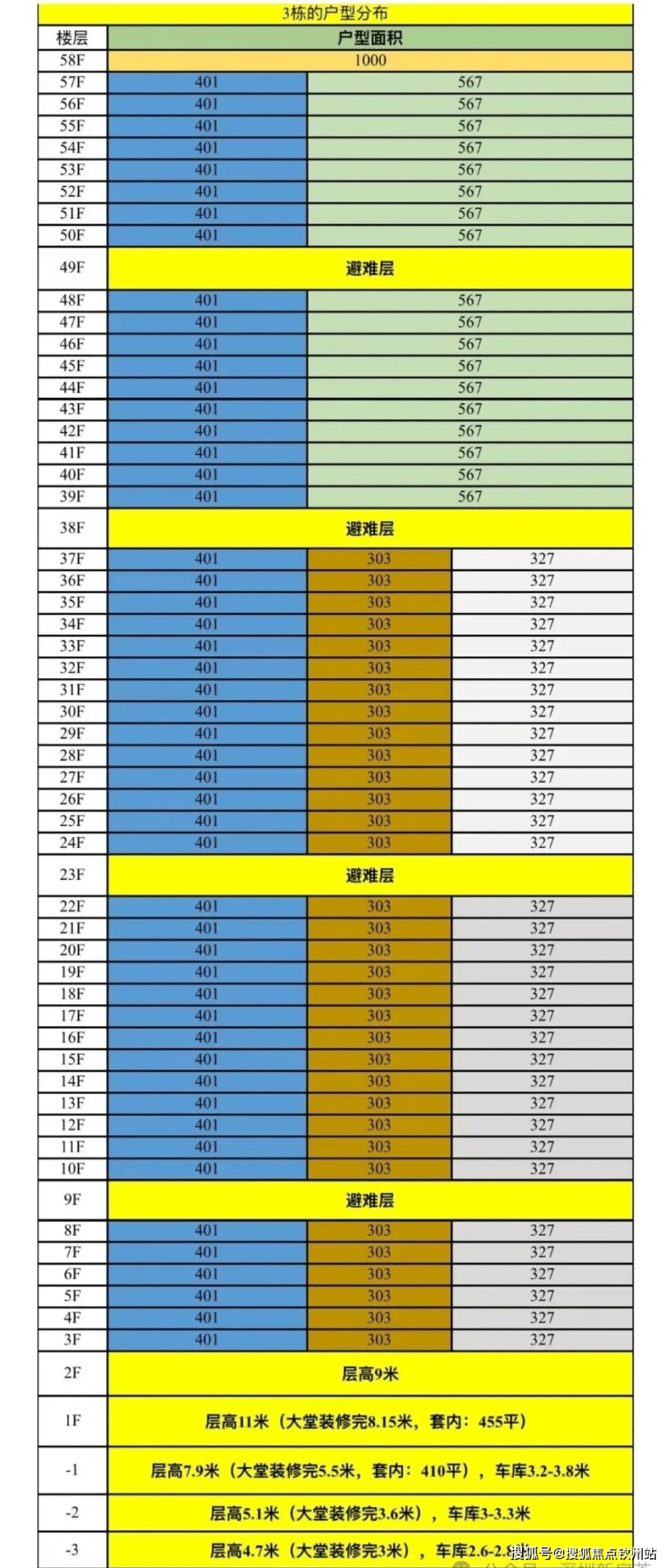 公寓主力户型为304㎡、327㎡、402㎡、570㎡以及1032㎡,公寓层高3.6米,低区5T3,高区5T2。