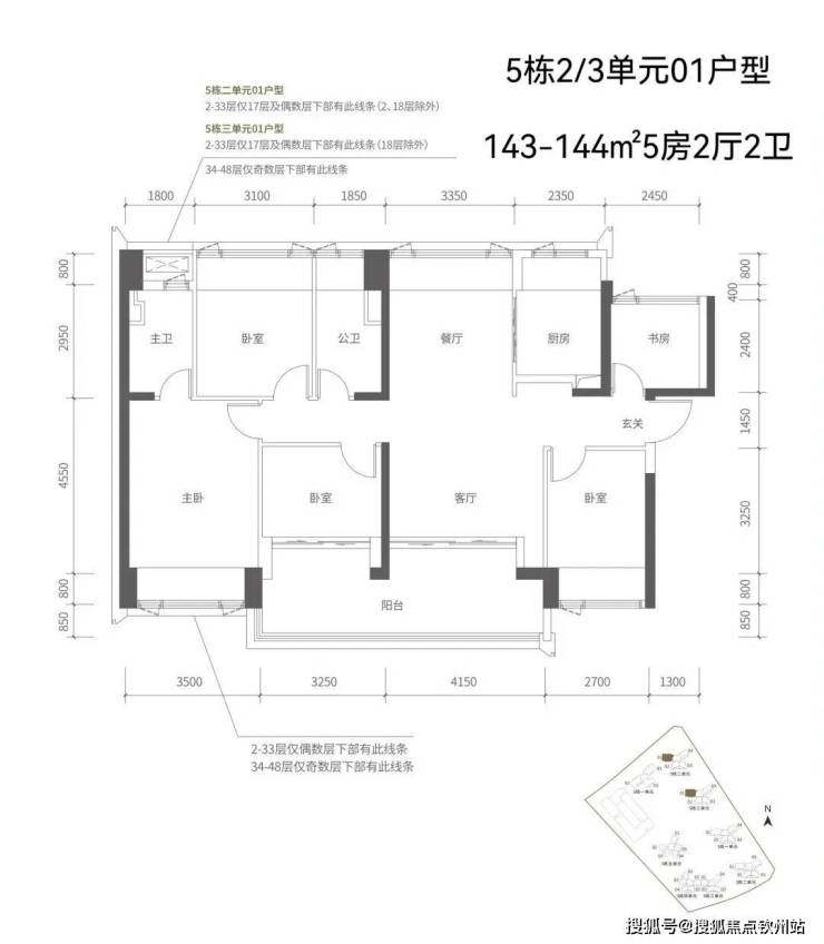 【五栋三单元-平面图】3梯4户,4条腿,跟二单元的户型产品一模一样,01号房户型约144㎡的5房2厅2卫,02、03号房户型约96㎡的3房2厅2卫,04号房户型约115㎡的4房2厅2卫。