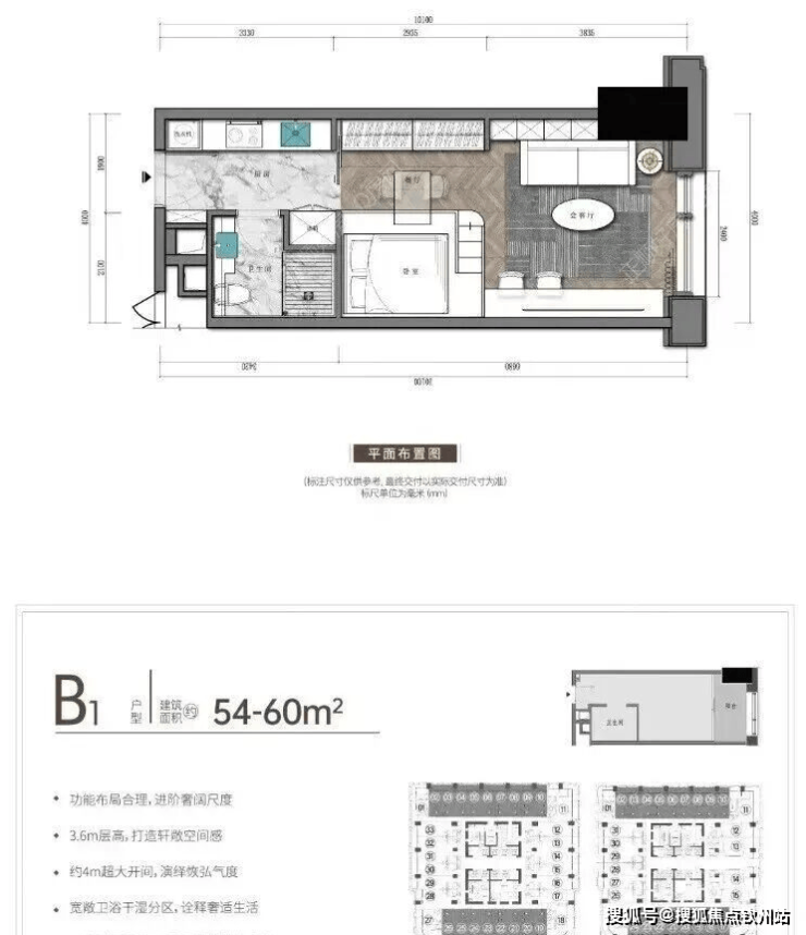 建面约54-60㎡B1户型:配备独立玄关,大面积落地窗搭配约4米开间,空间通透开阔;契税新政后置业成本进一步降低,总价门槛友好,无论是年轻人自住,还是作为长线持有,灵活性都非常高。