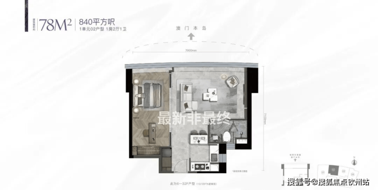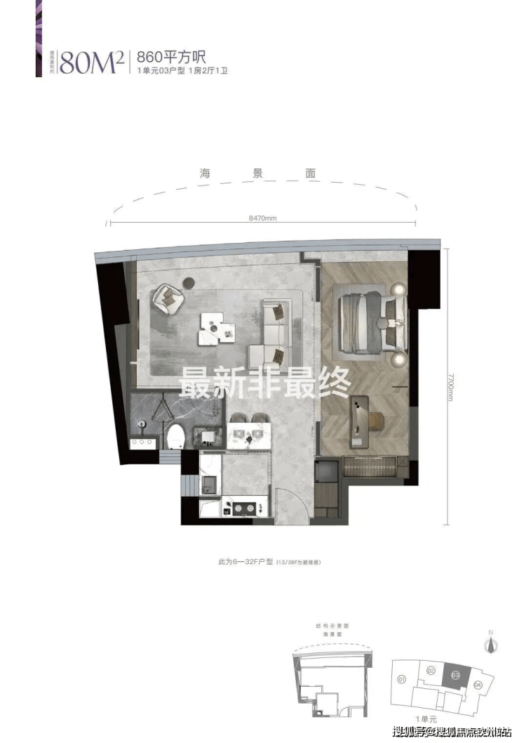1房2厅1卫,超8米绝版景观面,看一线海景、澳门景,户型方正实用,配有明火厨房