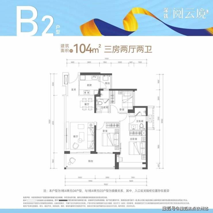 104㎡的3房2厅2卫B2户型-1栋4单元03.04户型,竖厅格局,客厅3.5米开间,LDKB一体化,S墙设计预留冰箱卡槽位,三开间朝南,动静分区,一字型厨房带1个2.43㎡大的生活阳台,卫生间干湿分离。客厅连接次卧出11.43㎡大阳台正南朝向,得房率80%(不含赠送),加上赠送后得房率约89.45%。