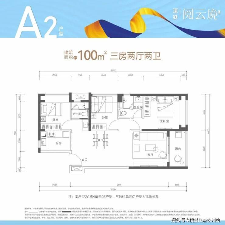 100㎡的3房2厅2卫A2户型-1栋4单元01.06户型,竖厅格局,客厅3.5米开间,LDKB一体化设计,动静分区,L型厨房,公卫三段式干湿分离。阳台5.95㎡正西或正东朝向,得房率80%(不含赠送),加上赠送后得房率约88%。