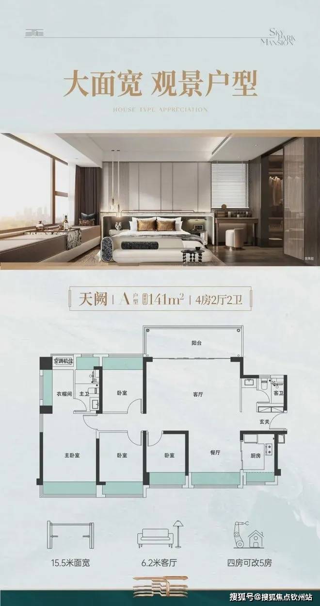 在户型设计上,更可见振业深厚的市场研究及产品打造功力。比如约143㎡大四房户型,整个户型15.6米超大面宽、南北通透,客厅6.2米超大面宽,甚至具备可变“五房”的灵活空间改造潜力。