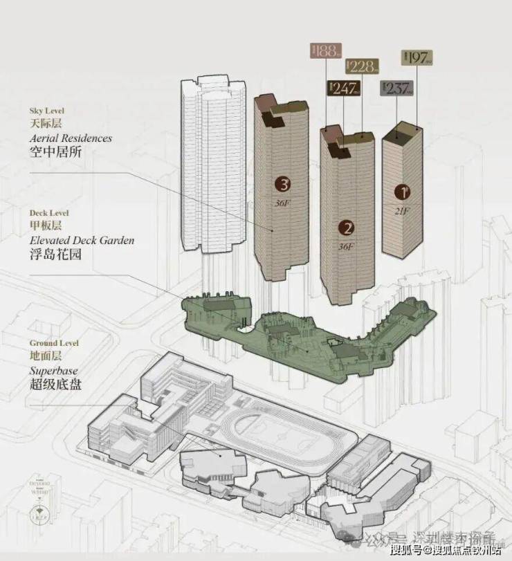 集合多家大师级机构的智慧,以浮岛甲板的设计手法,打造功能复合的“超级底盘”,将整个社区抬高12米,构筑出两个能量完全不同的“场域”。