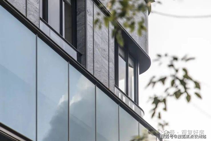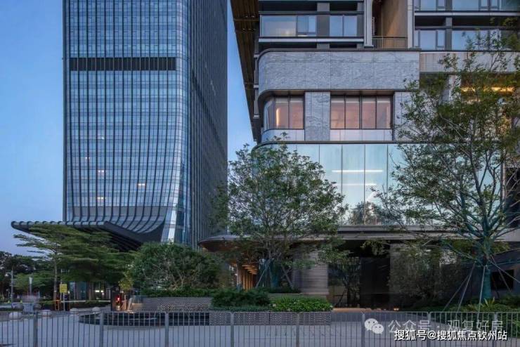 塔楼采用大面积的270°转角凸窗的形式,削弱建筑体量感,弱化建筑边际,形成与豪方天际办公楼相呼应的公建化立面效果。立面材料主要为玻璃加铝型材线条和真石漆,强调现代材料虚实结合。塔楼顶部设计了约5m高塔冠,采用夹胶彩釉玻璃,将项目专属LOGO符号编织图纹融入其中,形成视觉昭示形象。