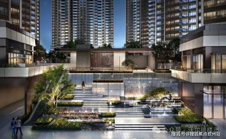 【高抬水韵主入口】主入口叠水流瀑搭配罗汉松,高抬轩昂门庭彰显尊荣威仪,于步步高升中体验归家的仪式感。