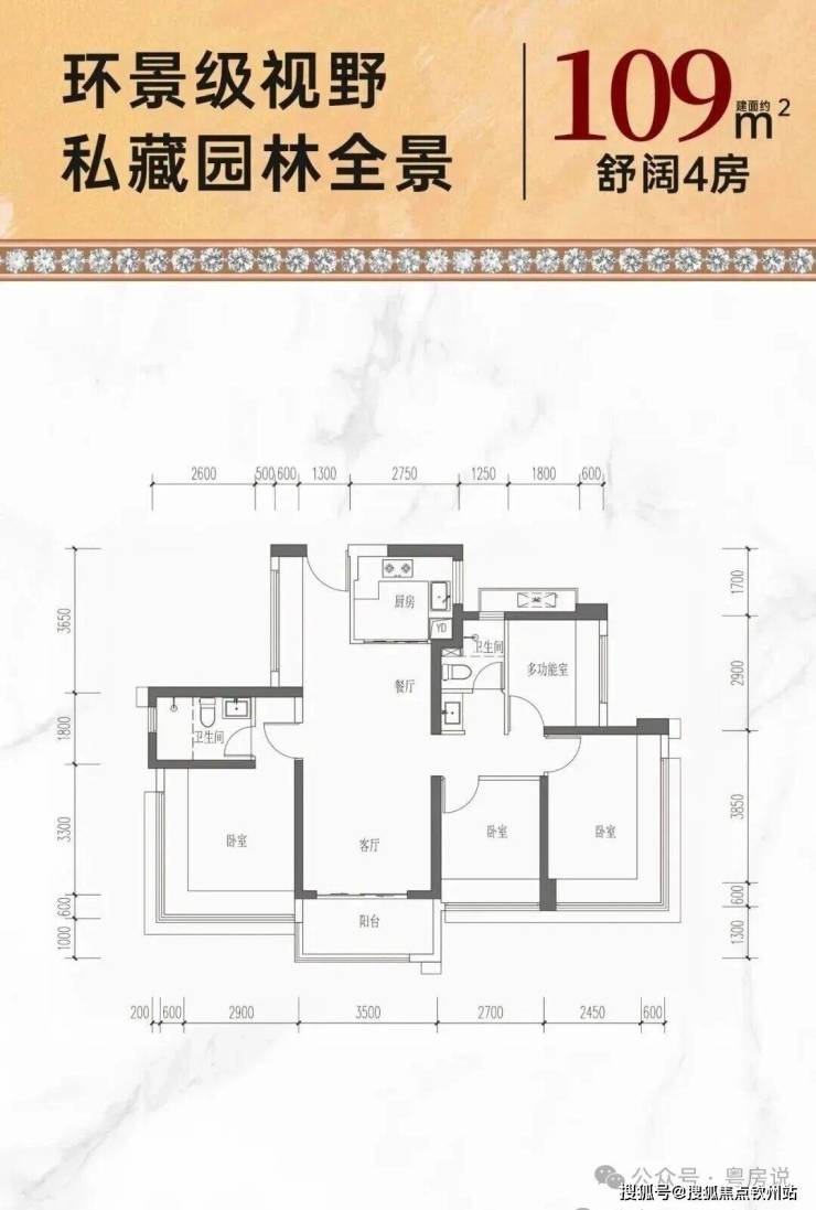 109㎡的4房2厅2卫,设计的是竖厅双龙抱珠格局,进门入户玄关,客厅3.5米开间,LDKB一体化,主卧270°无柱转角飘窗,分别做到了主卧15.45㎡/次卧13.57㎡/次卧9.31㎡/次卧6.96m²(包含墙体飘窗),U型厨房,公卫三段式干湿分离,得房率约74%(不含赠送),阳台西南朝向约5.95平。套内面积80.81㎡+赠送面积16.75㎡=实得面积97.56㎡,加上赠送后得房率约89.34%。