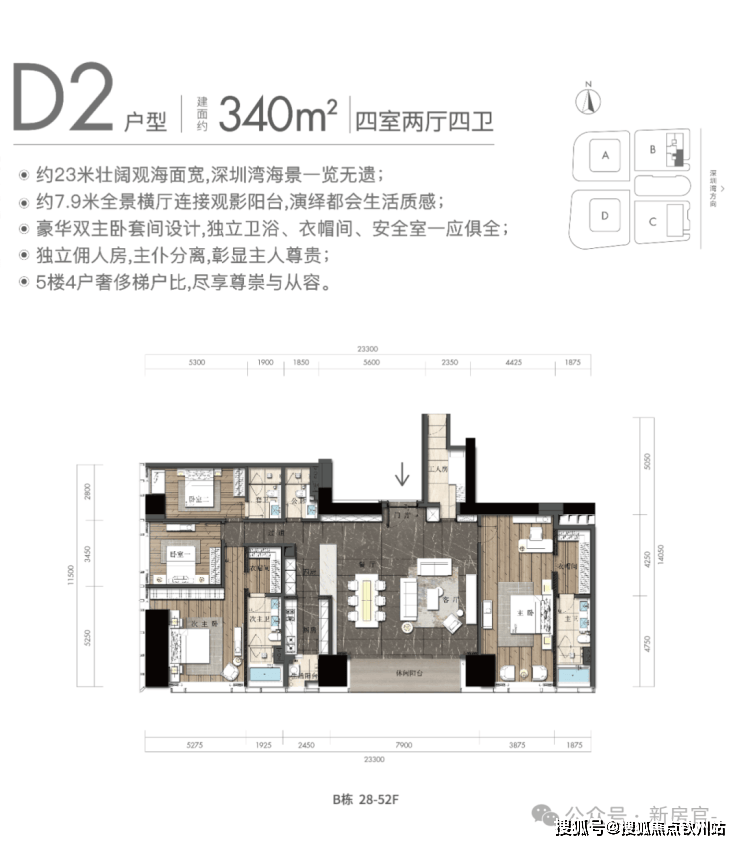 恒裕深圳湾4房户型为340、343平,总价区间为5227-7147万/套。