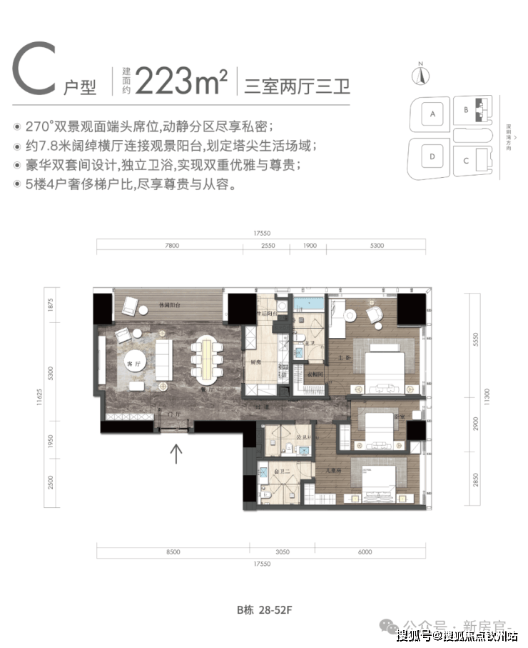 恒裕深圳湾3房户型为223平双套间,总价区间为2217-4166万。