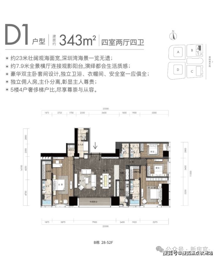 东向大户型拥有优秀的视野景观,大开间短进深双面采光室内通风采光能力优秀,主要生活空间拥有深圳湾海景;餐客厅开间3.9米带有有大型观景阳台;三套间双主卧配置,空间宽敞舒适独立全面;大型餐厨空间品质优秀,独立工人休息间带有卫浴;340㎡户型产品与343㎡户型结构类似,次卧南向日照充足,但工人房没有配备洗手间。