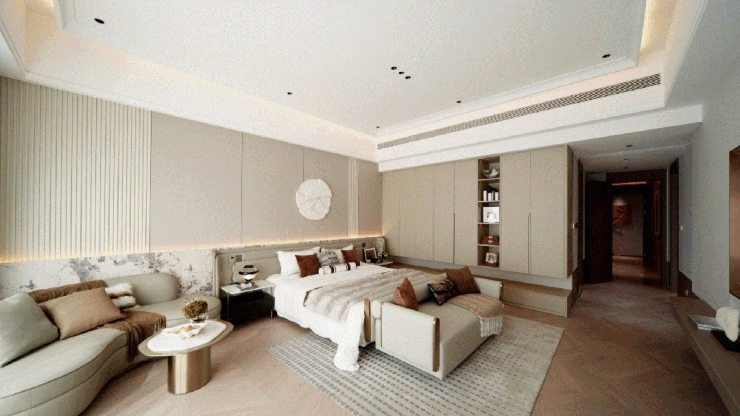 其中,约45㎡星级主卧,带双步入式衣帽间、预留浴缸、淋浴区、马桶、双洗手盆5件套配置的空间,让生活更加从容。
