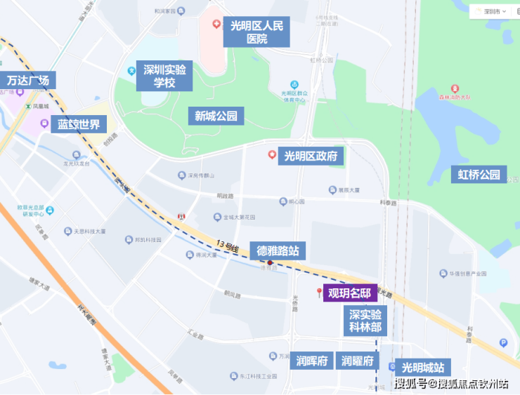 旁边就是润曜府、润晖府,东侧是待建的深实验光明科林部,不过观玥名邸靠着观光路,离13号线的德雅路站更近,仅300米左右!