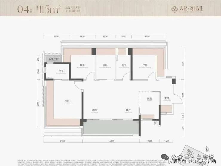 115㎡4房2卫,横厅户型,朝南看海,入户独立玄关,但三个次卧朝北;