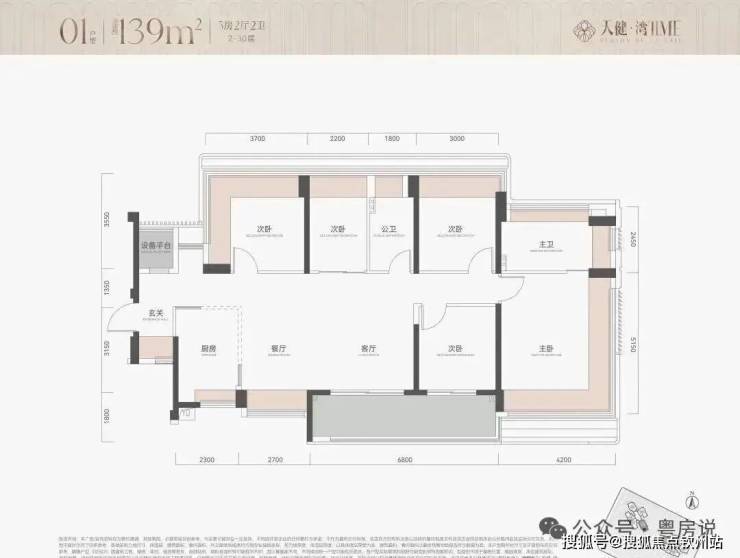 139㎡5房2卫,竖厅户型,朝南看海,户型结构和115接近,多了一间朝南卧室,主卫做了双面凸窗;