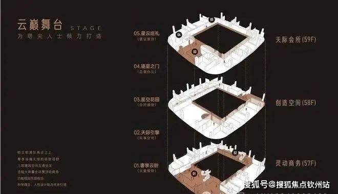 备注:57、58、59楼是顶层复式,可做企业会馆、会所等,云端共享办公、总裁私密办公区、商务接待区、总裁级私密接待区、西餐厅、酒吧等应有尽有!