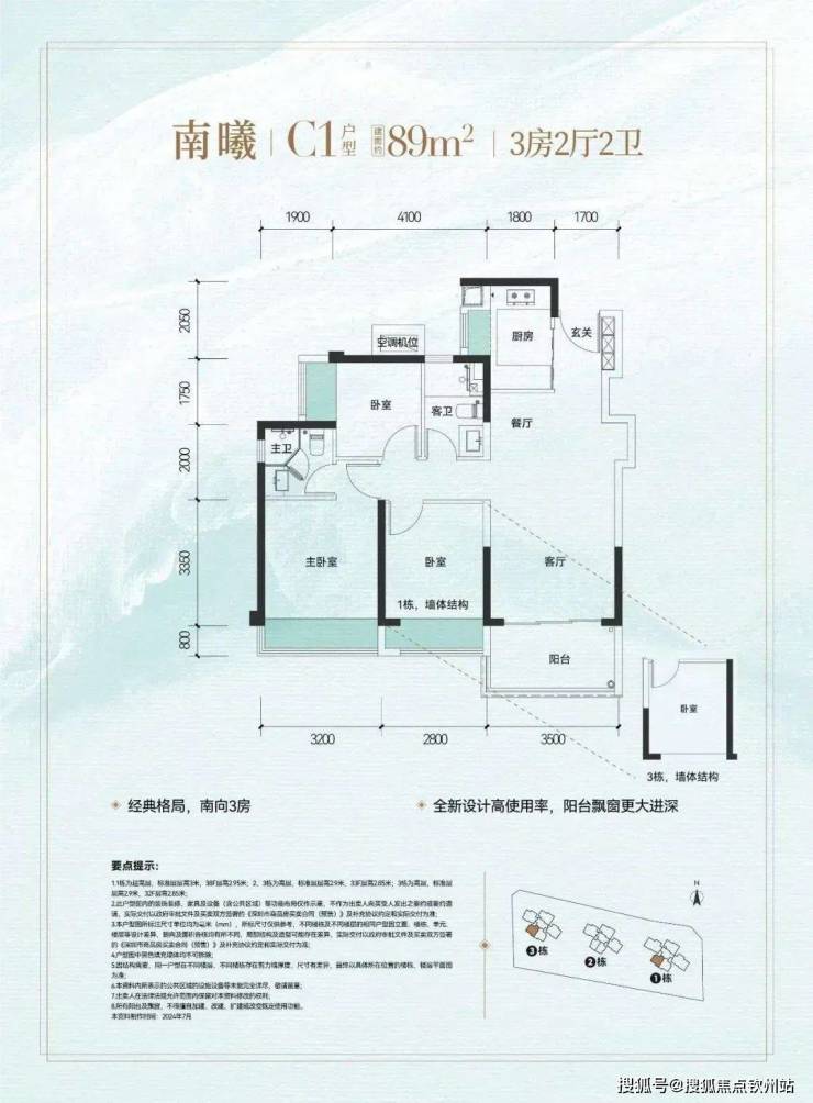 89㎡的3房2厅2卫(C1户型),设计的是经典竖厅格局,进门入户玄关,客厅3.5米开间,S墙设计预留冰箱卡槽位,三开间朝南,3个卧室分别做到了主卧14.28㎡/次卧11.62㎡/次卧7.62㎡(包含墙体飘窗),U型厨房,卫生间干湿分离,得房率约:81.78%(不含赠送),西南朝向。