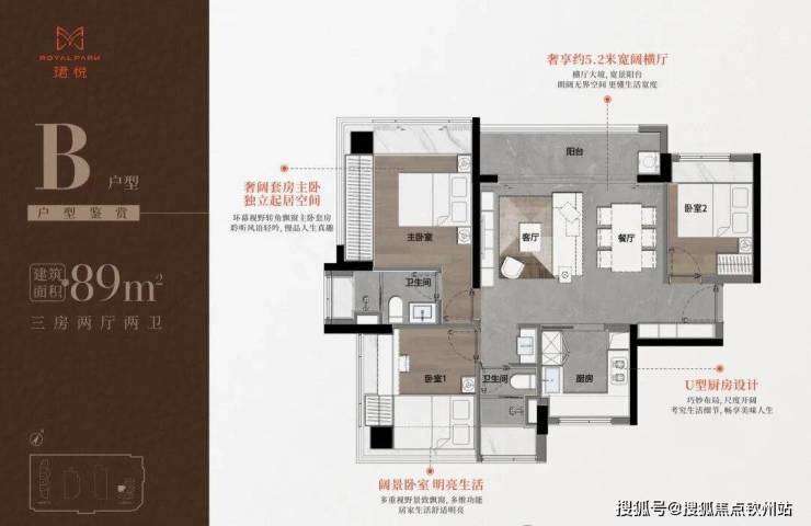 (1)89㎡三房:包含A/B/C三种户型,采用竖厅或横厅布局,三开间朝南,U型厨房与三段式公卫提升实用性。部分户型配备5.6米观景阳台,主卧双飘窗设计增加采光。