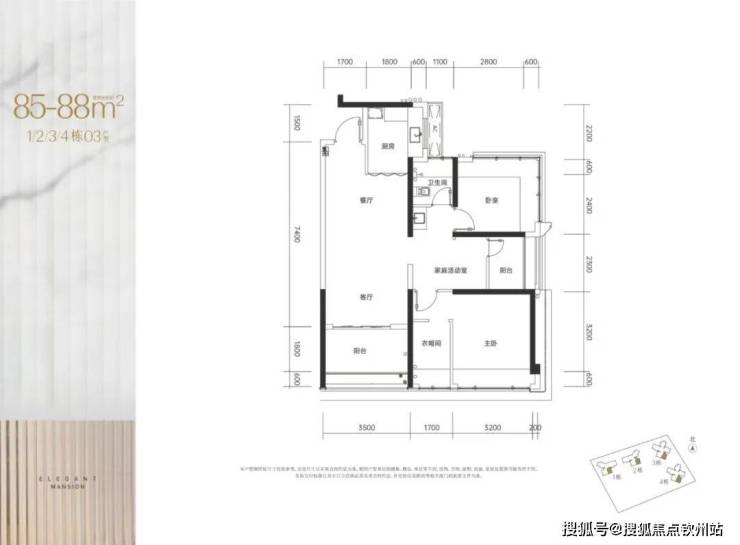 85-88㎡的3房2厅2卫,1/2/3/4栋02.03户型,设计的是竖厅格局,客厅3.5米开间,LDKB一体化设计,三开间朝南,3个卧室分别做到了主卧13.43㎡/次卧9.78㎡/次卧6.85㎡(实测面积,去掉墙体),L型厨房,公卫三段式分离,得房率约100-102.68%(包含赠送),东南或西南朝向。