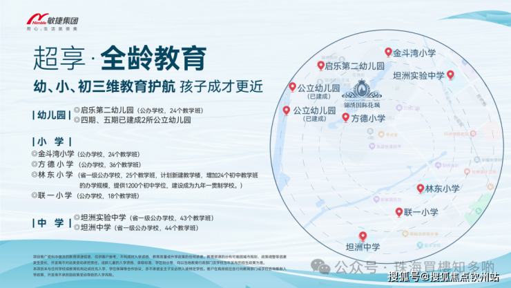 社区内规划建成3所幼儿园2所小学,四期方德小学现已开学!下楼即可到学校,给孩子多睡一小时;坦洲中学纳入中山市第一中学集团化办学,锦绣国际花城距坦洲中学仅约1.5KM,宝珠北路通车后,社区小业主步行即可到校。