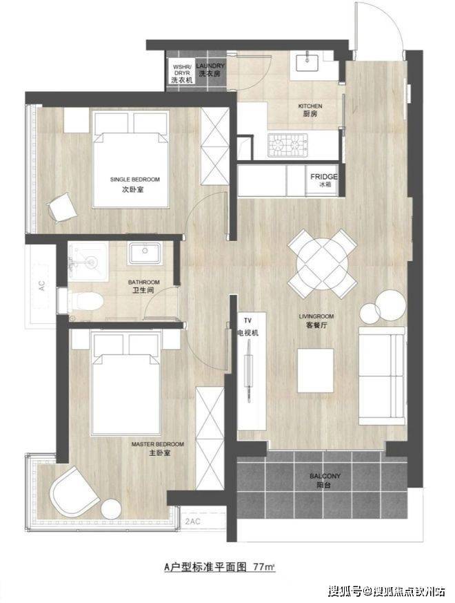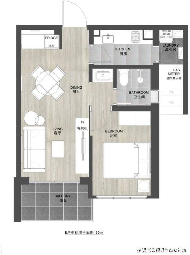 50㎡1房,带生活阳台,传统一房一厅布局。