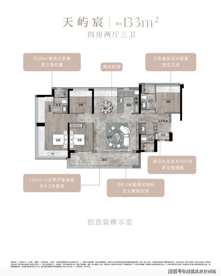 133㎡的4房2厅2卫,设计的是竖厅南北通透格局,进门入户玄关,客厅5.4米开间,餐客厅分离设计,客厅连接次卧出12.3m²的观景大阳台,L型中式+岛台灵动式厨房,公卫三段式干湿分离,得房率约78.27%(不含赠送),阳台主朝东南或西南向。靓点:超大客餐厅南北对流+8.2米长超大观景南向阳台,超大主卧+270°无柱转角飘窗