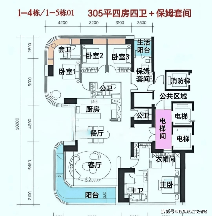 位于A栋(43F)共36套,层高3.6米,3T1,只做了4房5卫+保姆套间。