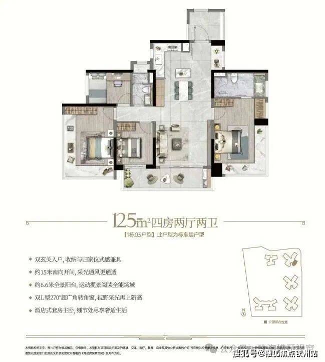 本次开放的建面约125㎡户型,做到了双玄关入户+超大景观阳台+4开间约15米面宽+奢阔4+1房。